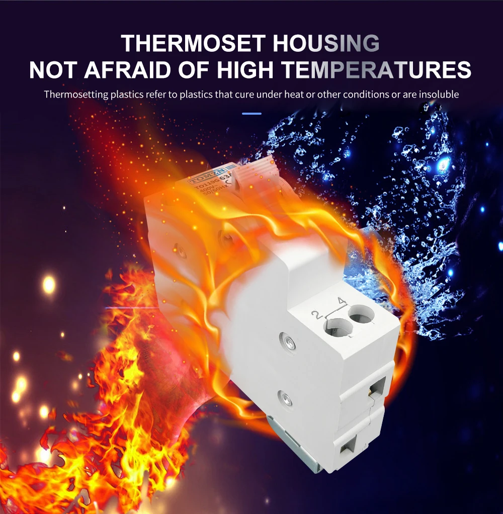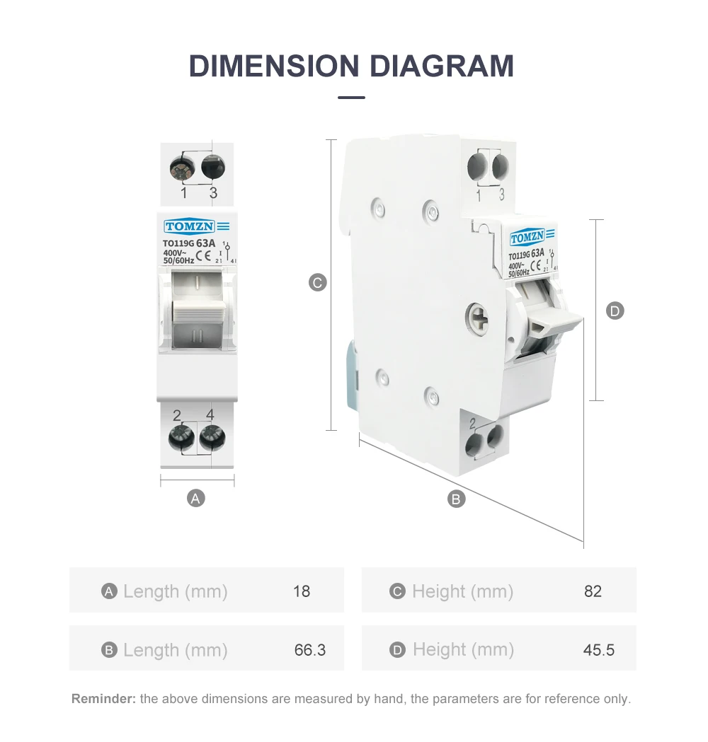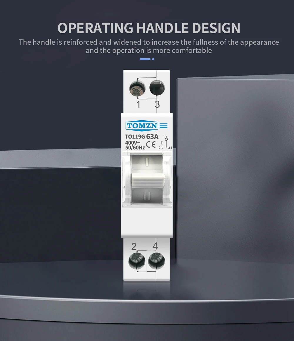 The TOMZN TO119G 1P 63A ChangeOver Switch Breaker is a manual transfer switch with built‑in breaker protection designed to safely control and alternate between two AC power sources (such as grid and generator or backup supply) for single‑phase systems. It ensures continuous power availability by letting the user manually switch to a secondary source whenever the primary supply fails, while also providing circuit protection. Made from flame‑retardant plastic and featuring a mechanical interlock to prevent simultaneous connection of both sources, it is easy to install on a 35 mm DIN rail and offers dependable performance for homes, offices, shops, and light industrial applications.